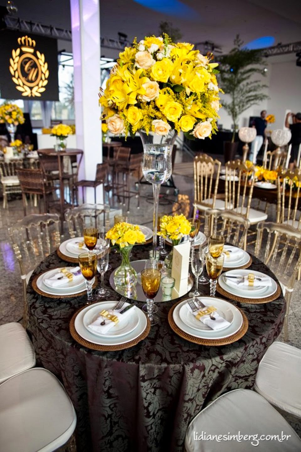 Ao escolher a paleta amarelo com branco, você pode optar também por ter uma terceira cor que ficará como coadjuvante, dará auxilio em pequenos detalhes. Um exemplo é o dourado, que traz um equilíbrio para a combinação.