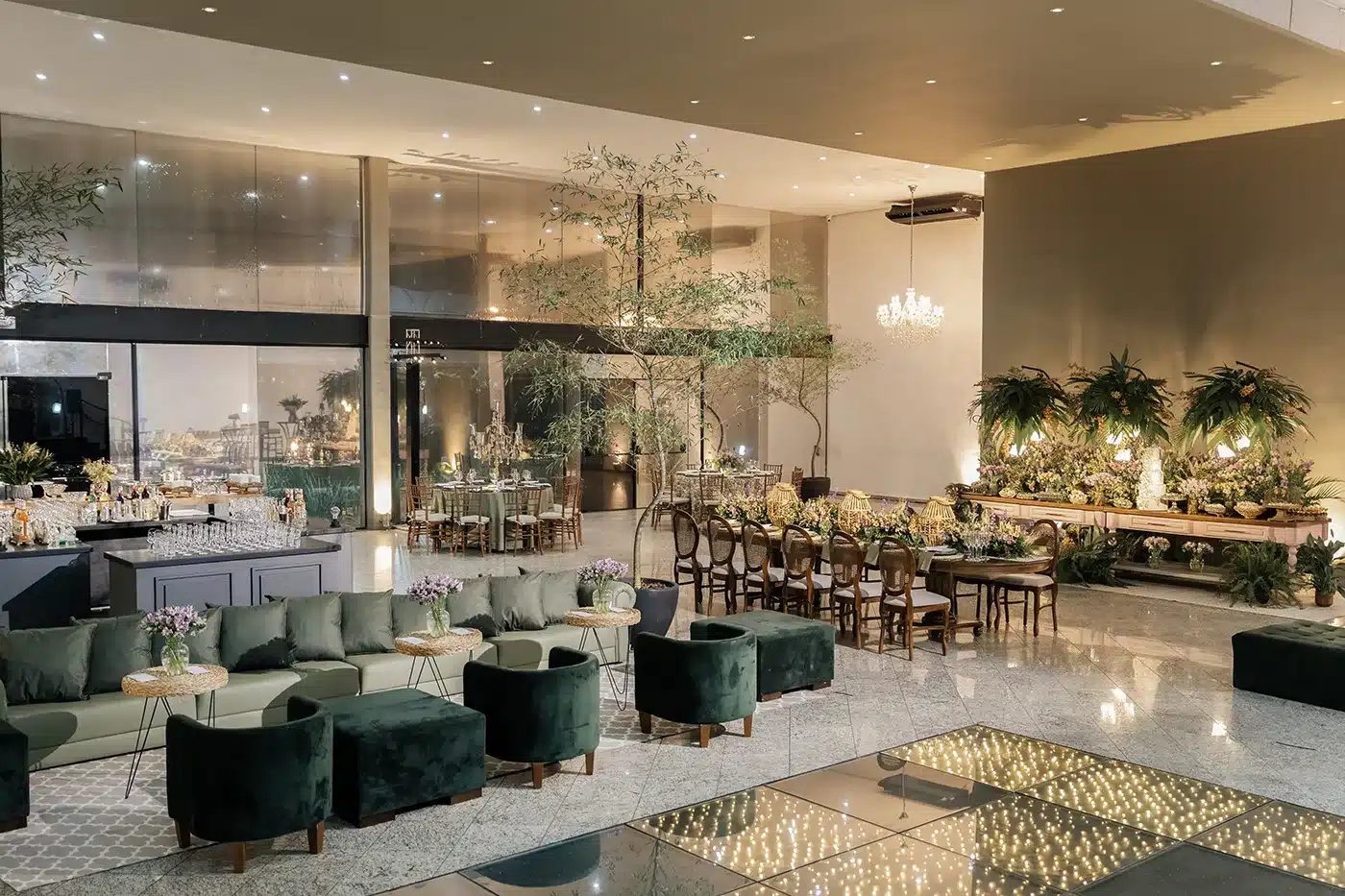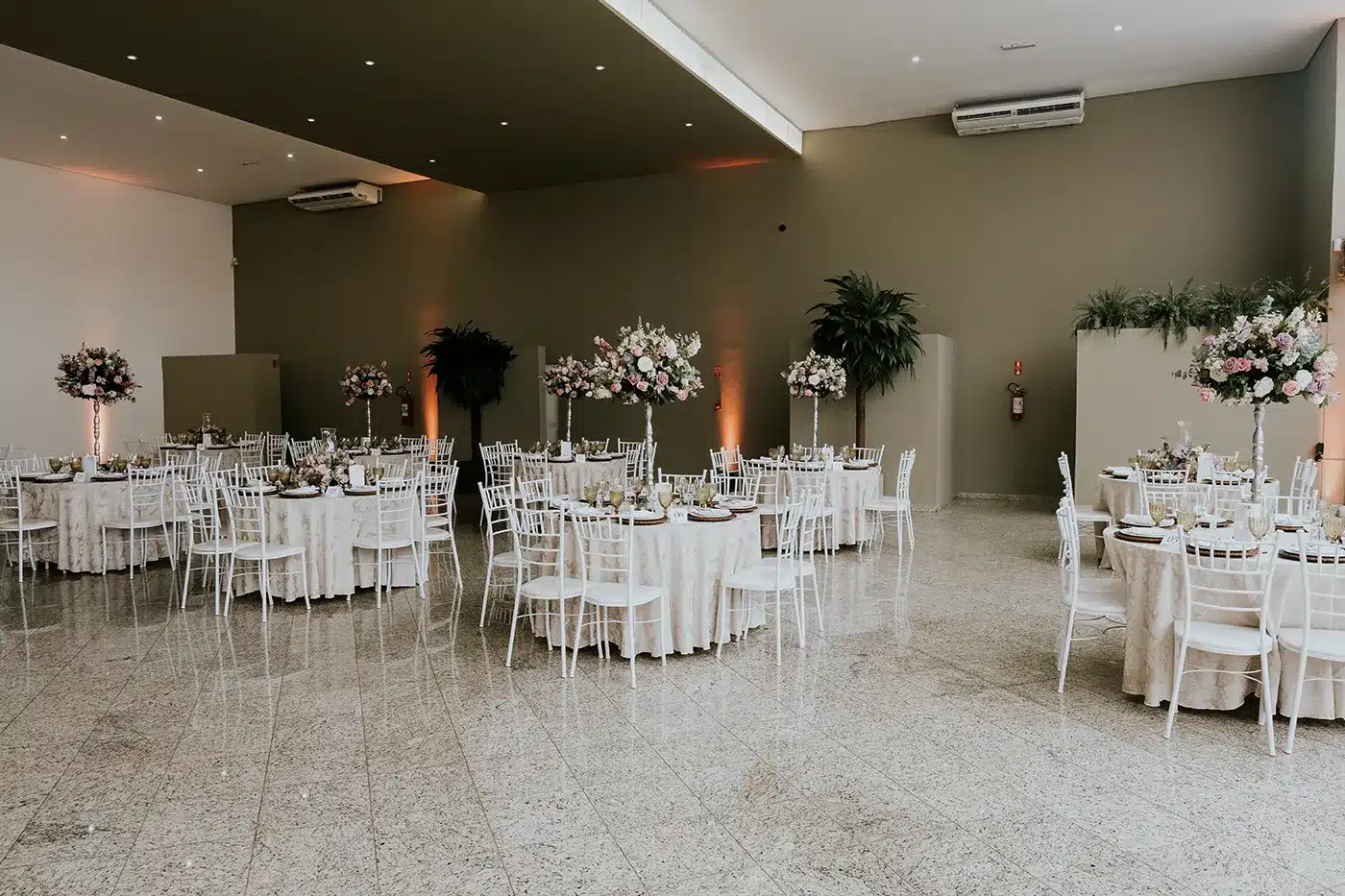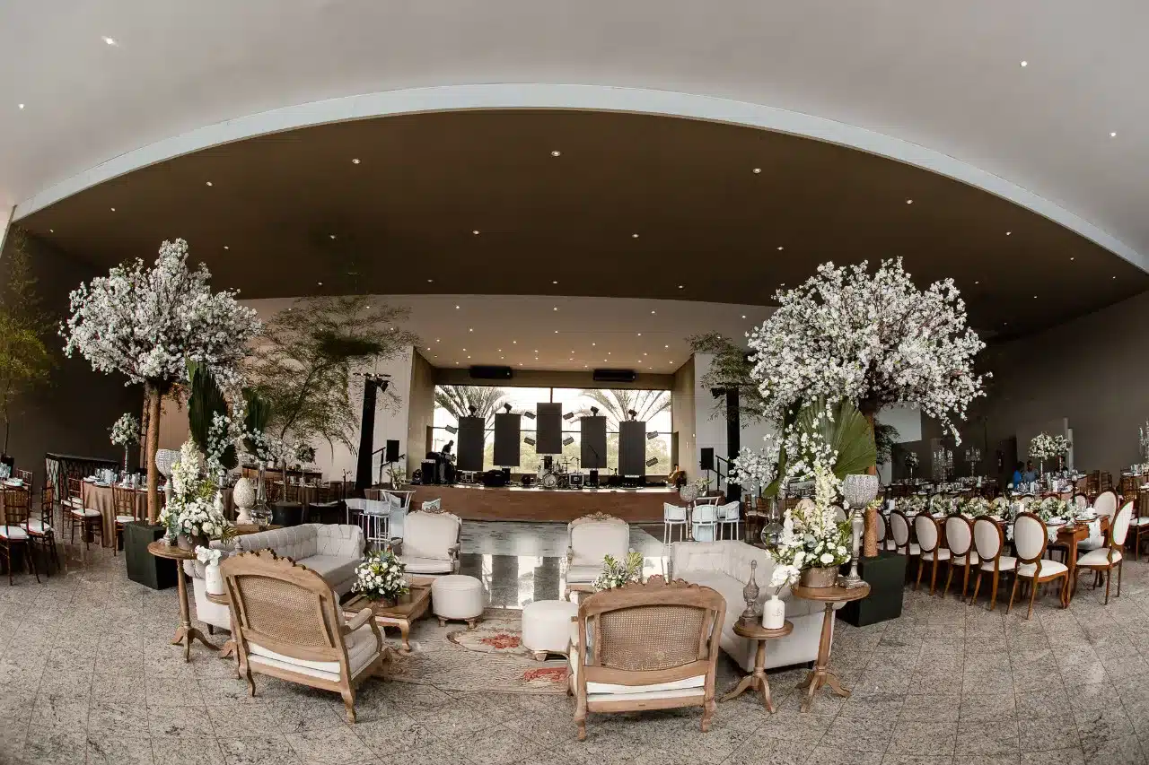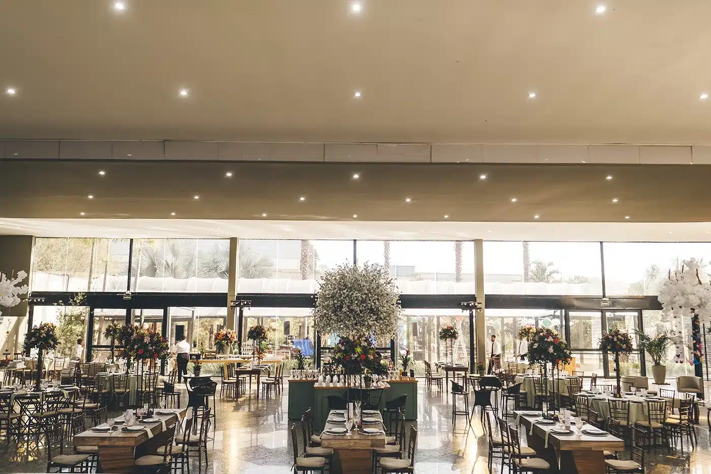 A partir de 40 convidados, já é possível montar um layout funcional e elegante, aproveitando todo o espaço de forma harmoniosa.